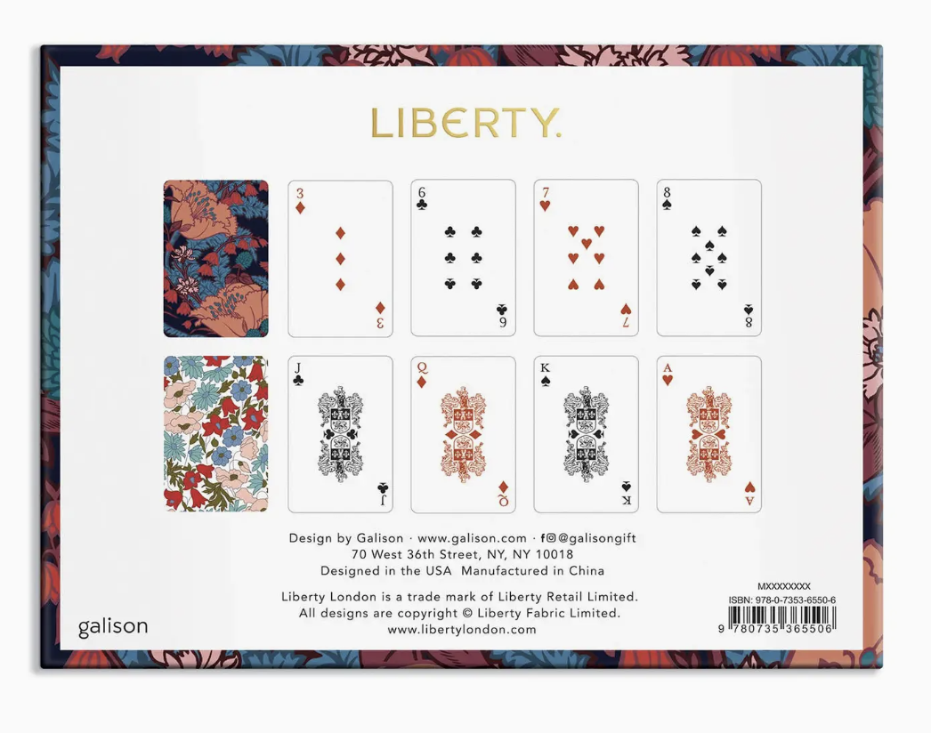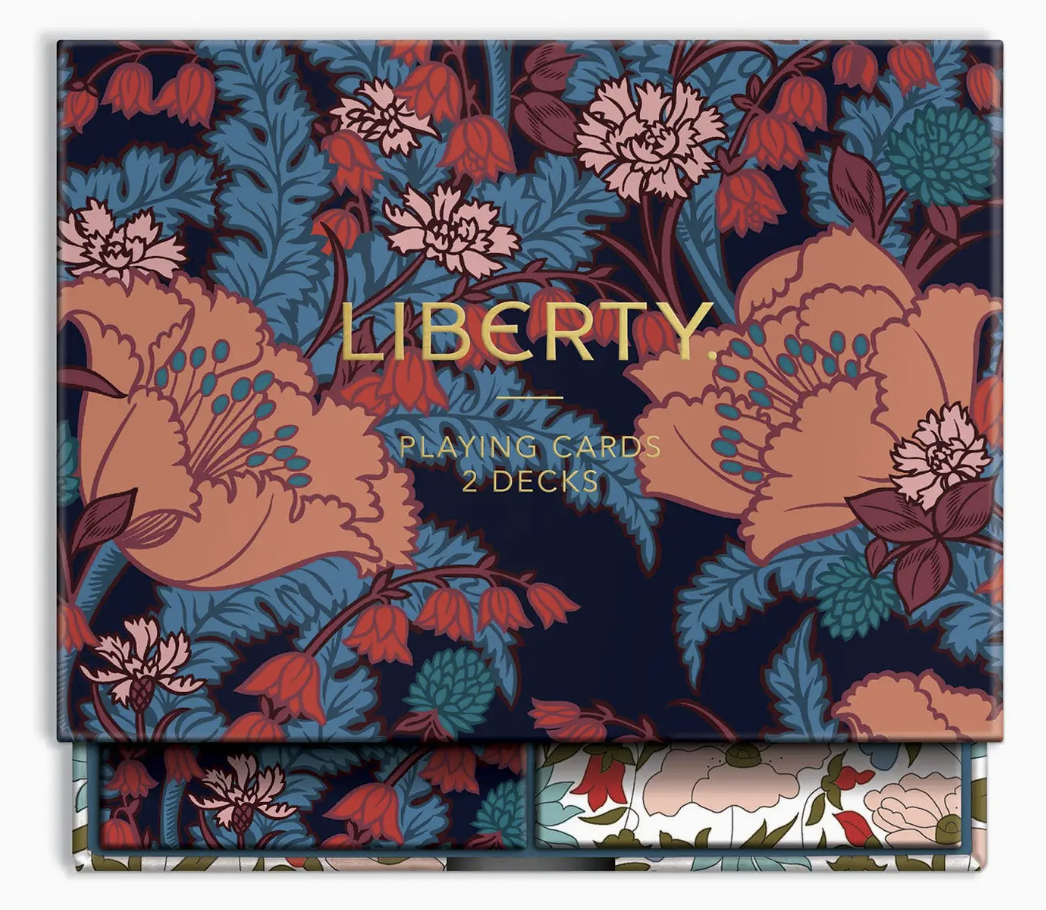 Liberty London is known for its floral and graphic prints and the offering of innovative and eclectic designs. The Liberty London Floral Playing Card Set features two standard size decks of playing cards in their iconic designs. Galison playing cards sets are packaged in a sturdy drawer style keepsake box perfect for gifting and easy storage. • Includes 2 decks of cards • Unique art throughout • Interior card deck boxes • Foil-stamped exterior drawer box • 6 x 4.5 x 1.25d”, 152 x 114 x 32 mm