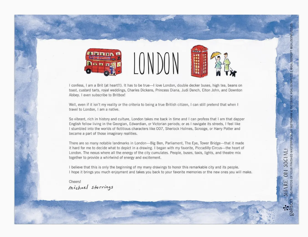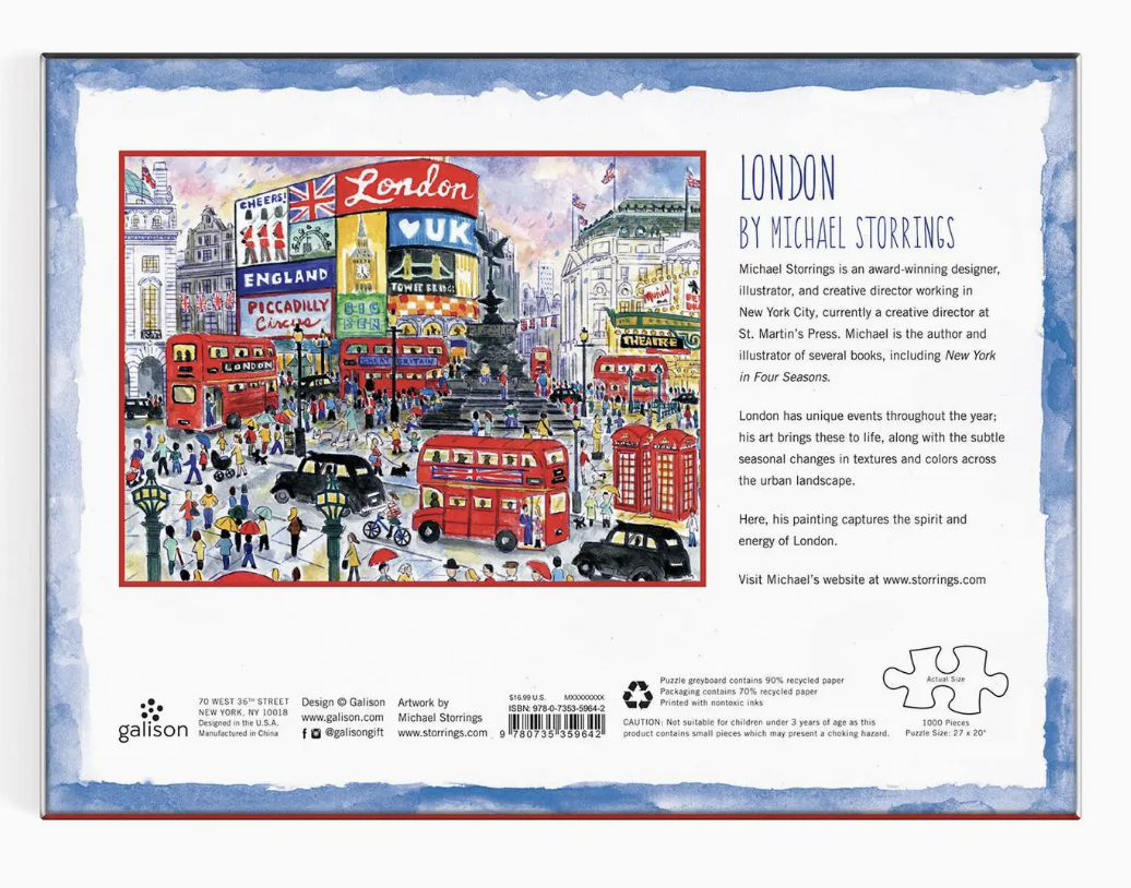 Award-winning illustrator Michael Storrings captures the special essence of cities in his art. Michael Storrings London 1000 Piece Puzzle from Galison brings to life the bustle of Piccadilly Circus in this detailed illustration. Packaged in a sturdy, easy-to-wrap box, Galison puzzles are perfect for gifting. – Puzzle: 20 x 27″, 508 x 686mm – 1000 pieces – Box: 8.25 x 11.25 x 2″, 210 x 286 x 51mm – Contains informational insert about artist and image – Minimal Puzzle Dust – Ribbon Cut