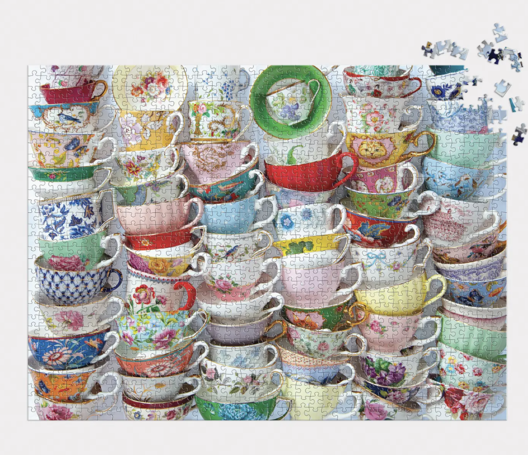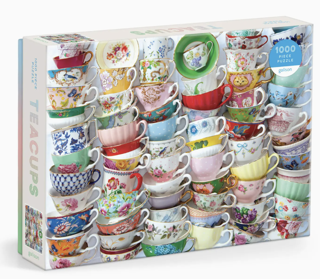 Teacups 1000 Piece Puzzle features a Regency core style mix of vibrant teacups, with patterns and details to make any teaparty enthusiast proud. • 1000 pieces, Ribbon Cut • Box: 11.25 x 8.25 x 2”, 286 x 210 x 51mm • Puzzle: 27 x 20”, 686 x 508 mm • Includes Puzzle Insert with Puzzle Image • Puzzle greyboard contains 90% recycled paper. Packaging contains 70% recycled paper and is made responsibly from FSC-certified material. Printed with nontoxic inks.