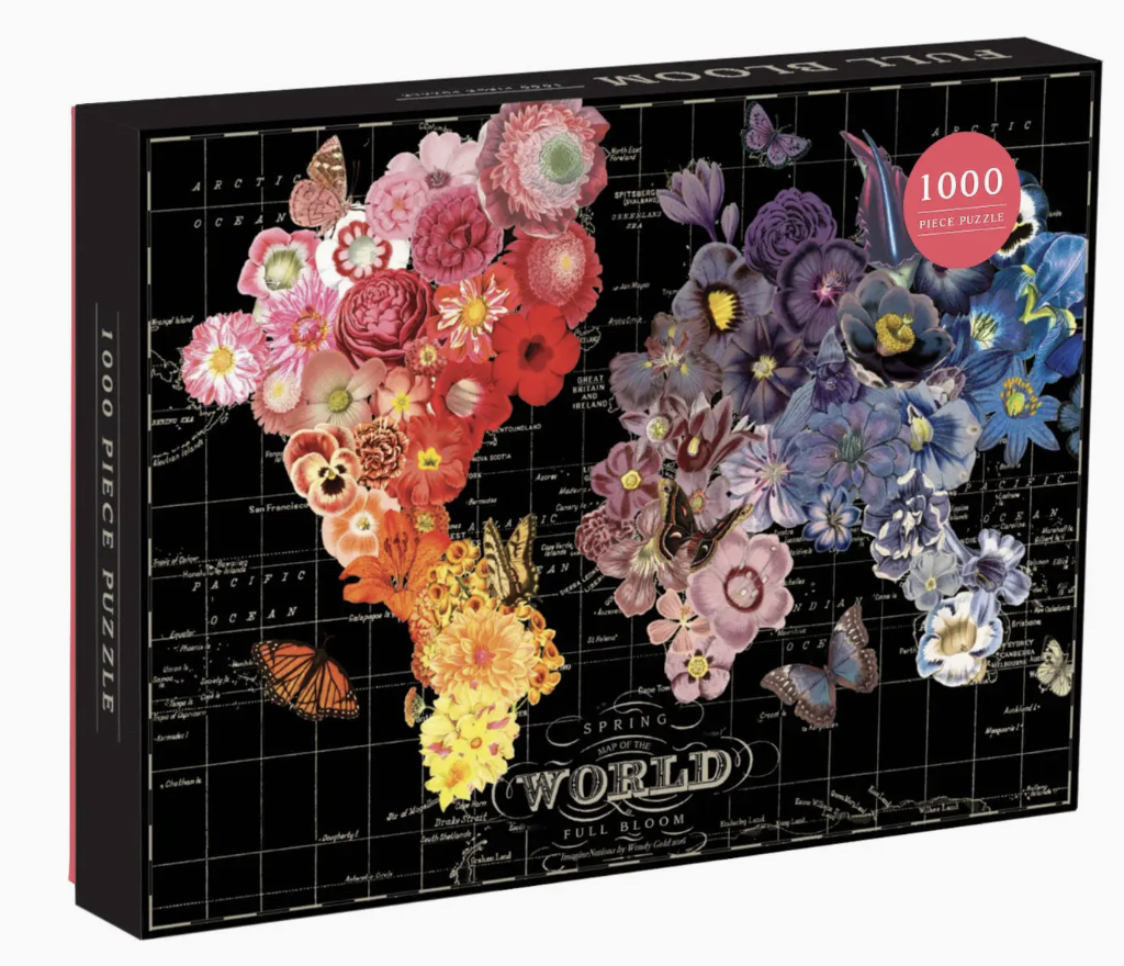 Galison’s Full Bloom 1000 Piece Puzzle features vintage images of butterflies and flowers collaged and clustered over a map of the world with a stark black background. Wendy Gold ‘s stunning collage artwork makes for a challenging and gorgeous puzzle that your family will love piecing together. – Puzzle: 20 x 27″, 508 x 686mm – 1000 pieces – Box: 8.25 x 11.25 x 2″, 210 x 286 x 51mm – Contains informational insert about artist and image – Minimal Puzzle Dust – Ribbon Cut