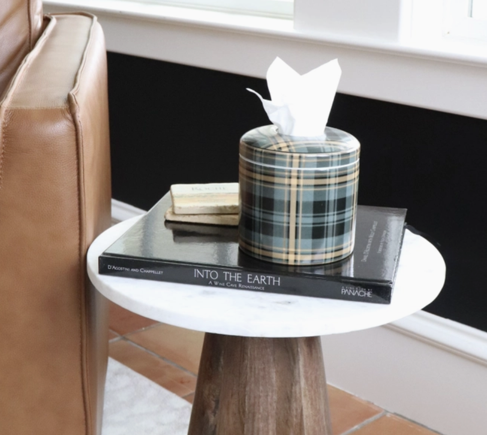 Meet Presley, a refined ceramic tissue vessel wrapped in timeless plaid. With rich forest tones and warm golden accents, Presley balances tradition with modern polish. The glossy finish and tailored pattern bring effortless sophistication to any space — from cozy study to elegant bath. Masculine and refined with a thread of Americana tradition. Designed to turn an everyday essential into a statement of style. The Details: – Ceramic re-fillable tissue vessel – Please note that due to the handmade nature of this product, some vessels may have slight imperfections and the pattern on the lid and base may not match up seamlessly. Dimensions: – 5” x 5”