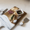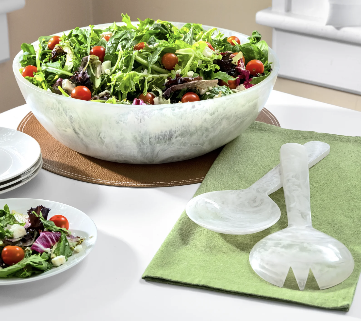 White-on-white swirls are casually elegant, making this bowl beautiful inside or outside. A matching salad set comes with each bowl. Makes a great gift for housewarming, engagement, wedding and everyday! Made of food-safe resin. Sizes: Bowl: 14″ x 14″ x 4.5″; Salad Set: 12.25″