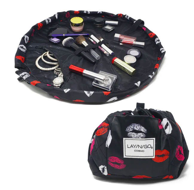 The Lay-n-Go® COSMO (20″) is a patented cosmetic bag that allows you to see all of your cosmetics at once, and clean up in seconds. No more digging and dumping in a traditional black hole make up bag. The raised lip keeps make up and brushes from rolling off the counter. The Cosmo is machine washable and wipeable!  Home or away!  Do your daily make up routine at the gym, or in your office, on a clean dry surface. Pull the drawstring cord and the Cosmo cinches completely closed to stow or travel. Pack the Cosmo in your suitcase, tuck it in your overnight bag. The Cosmo conveniently fits anywhere! Lay-n-Go COSMO is a smart and easy 4-in-1 solution, clean surface, quick cleanup, carryall, and storage.