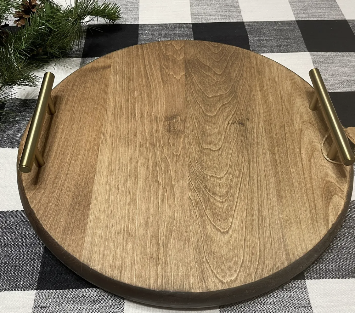 Here is a Round charcuterie board that will last a lifetime. These are made from 4 different kinds of wood. Pine, oak, cherry, and maple. All these are made from top of the line wood and are 1 in thick. These come with handles for your convenience and have the option of being a Lazy Susan. We stain these with a minwax stain and then treat them with butcher block so that they are food safe.