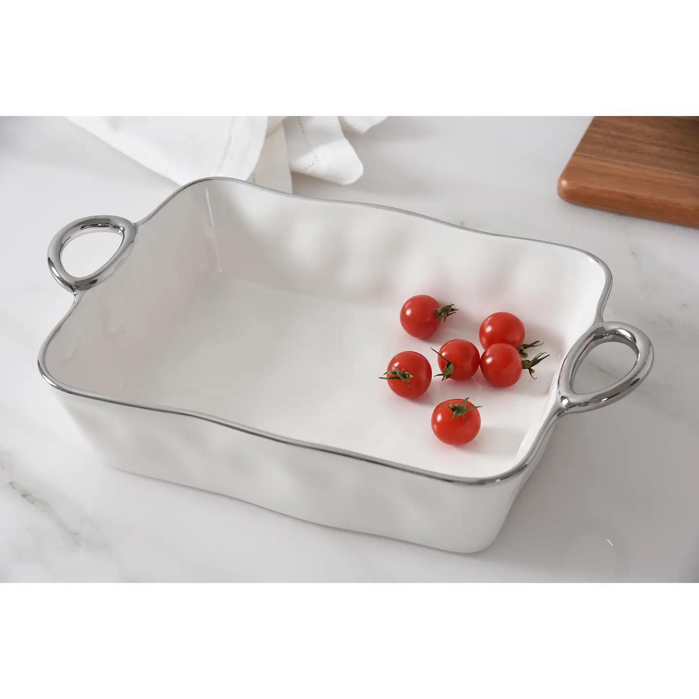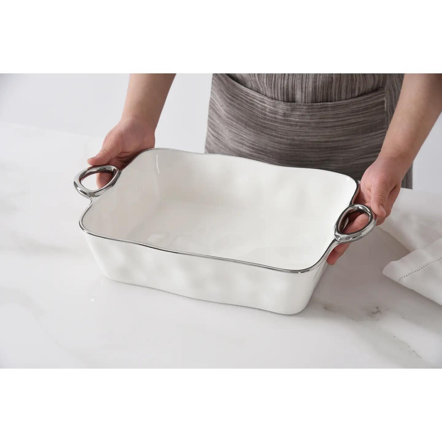 Elevate your baking experience with our 11″ x 9″ Rectangular Baking Dish from our Handle with Style Collection, designed to meet all your culinary needs. Its spacious dimensions make it ideal for preparing family-sized casseroles, lasagnas, roasted vegetables, and desserts. With sturdy handles for secure grip and a timeless look that transitions seamlessly from oven to table, this baking dish is as practical as it is stylish. Gleaming white porcelain with smooth and graceful rim and handles in silver tone titanium. Food safe. Dishwasher safe. Oven safe to 500°F/260°C. Easy Care. Capacity: 3 Qt.