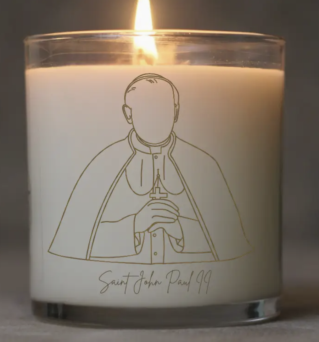This candle captures the spirit of St. John Paul II’s love for nature and adventure. A smooth vanilla top note brings warmth and familiarity, leading into a heart of calming lavender—a nod to his deep peace and prayerful heart. The fragrance settles into a smoky, woodsy, and musky base, evoking the crisp air of the Polish mountains where he once skied. A scent as bold, comforting, and inspiring as the saint himself. 𝐏𝐚𝐭𝐫𝐨𝐧 𝐨𝐟: • World Youth Day • Young Catholics • Families • Catholic Sports 𝐅𝐞𝐚𝐬𝐭 𝐃𝐚𝐲𝐬 • October 22 𝐃𝐞𝐭𝐚𝐢𝐥𝐬 • Weight: 9 ounces • Burn Time: 40+ Hours • 100% All Natural Soy
