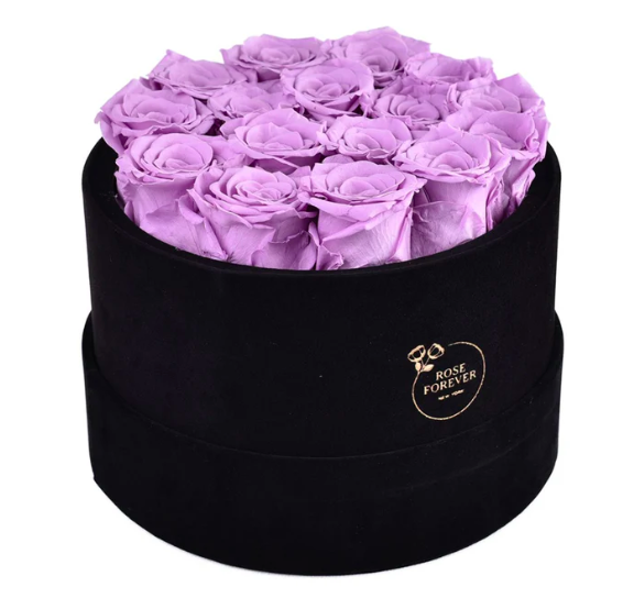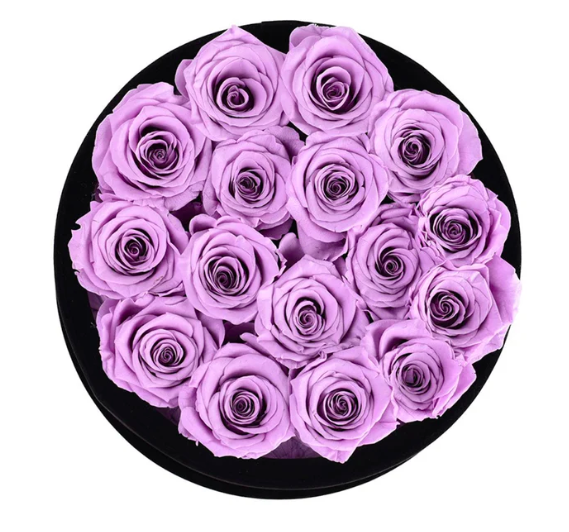 This arrangement features 16 Lilac forever roses, our signature creation. Hand-picked and hand-crafted by the finest artisans, our eternity flowers are placed in a Black Velvet box. The Parisian hat box design evokes elegance, and features an embossed gold Rose Forever stamp that adds a touch of luxury.