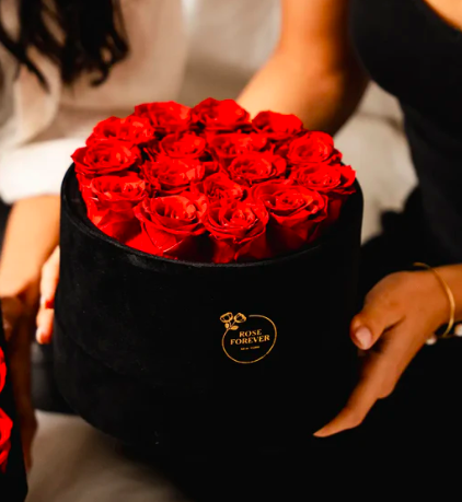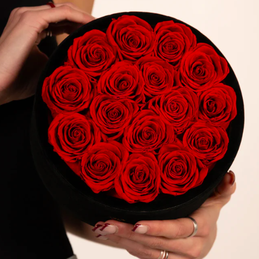 This red roses bouquet has 16 gorgeous preserved roses that last for a year. To make each rose arrangement look fresh and elegant we are using the best Preserved Roses quality that you can find on the market, and we carefully arrange them in black, vegan velvet, Parisian hat boxes.