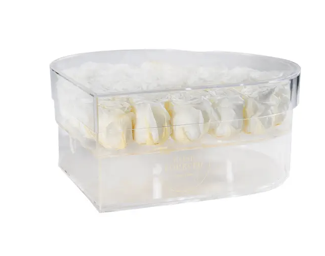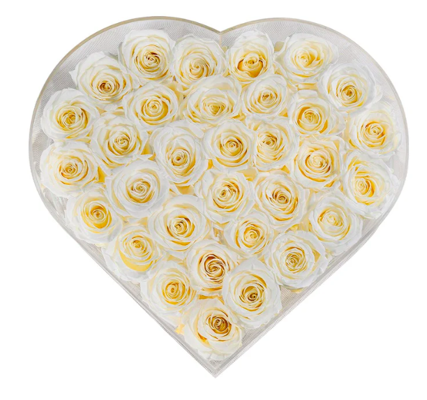 This 35 Ivory roses arrangement is the perfect centerpiece of a chic room decor and will last for a year. To make our creations unique we are using the best Preserved Roses quality that you can find on the market, and we carefully arrange them in these heart shaped acrylic crystal boxes. Every box has a small drawer to keep your jewelry or other accessories.