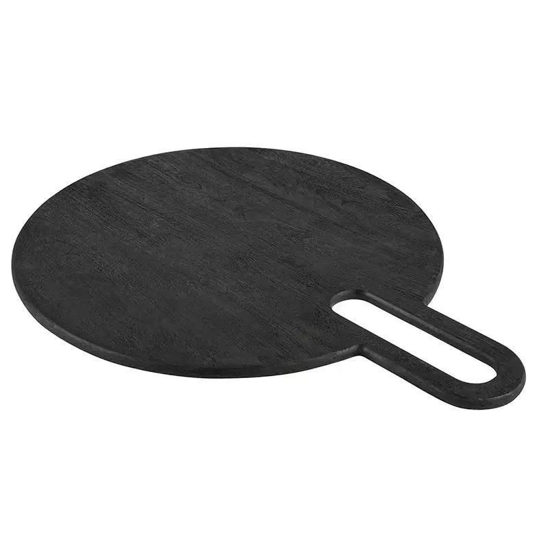 Our Large Round Savana Wood Board is made of acacia wood and has a brushed black wash finish. Perfect for charcuterie, antipasto or desserts. · Material: Acacia Wood/Genuine Leather · Size: 22.8″ L x 17.75″ W x .6″ D · Care Instructions: Wipe Clean with a Damp Cloth