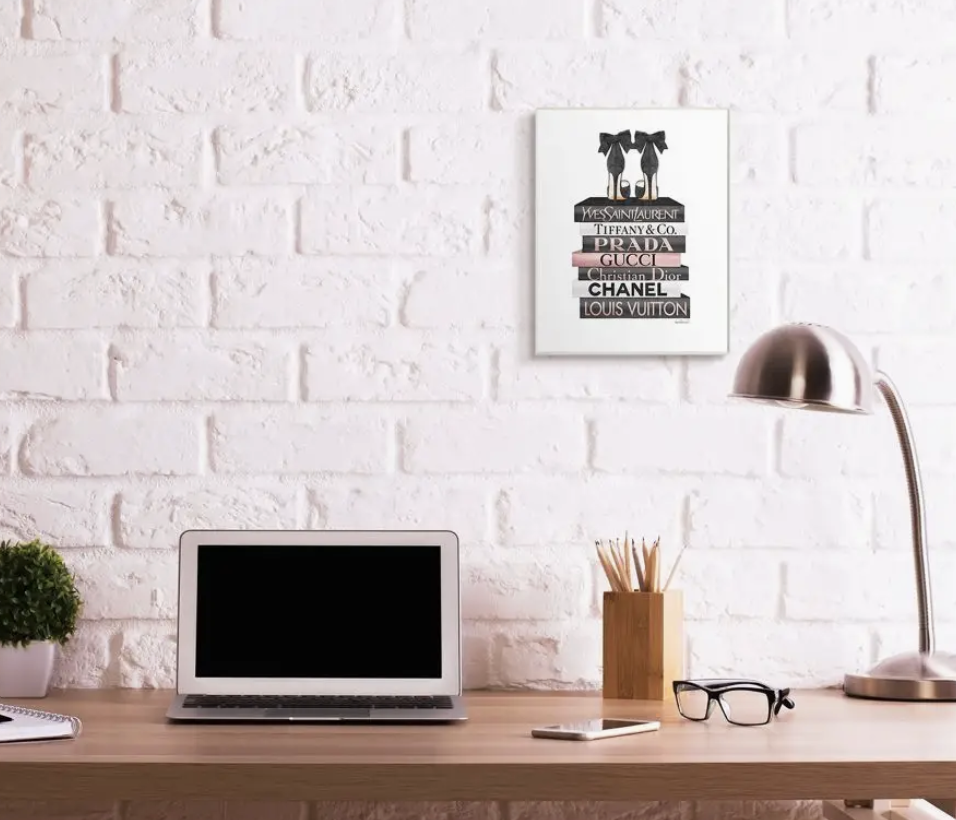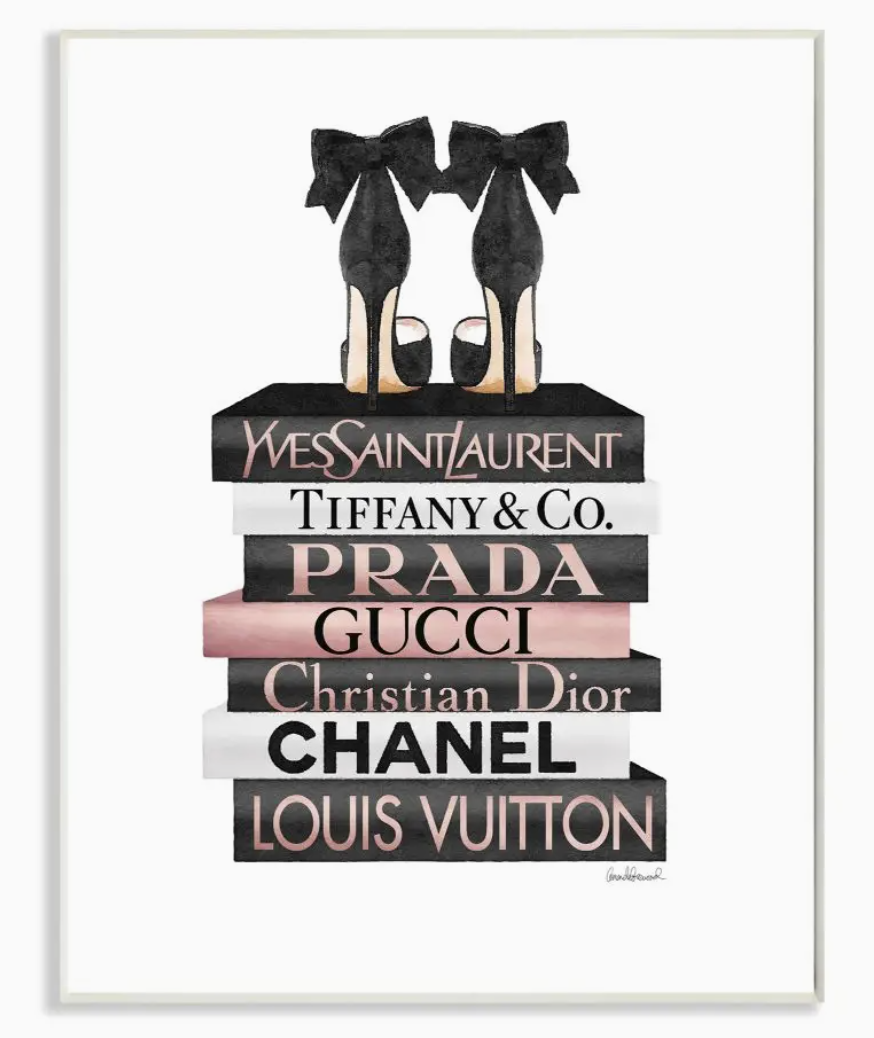 Elegant Black Bow Heals on Glam Designer Bookstack Wall Plaque Art by Amanda Greenwood. Proudly made in the USA, all of our wall plaques start off as high-quality lithograph prints that are then mounted on durable MDF wood. Each piece is hand finished and comes with a fresh layer of foil on the sides to give it a crisp clean look. It arrives ready to hang with no installation required and comes with sturdy clear corners to keep it from damaging in transit.