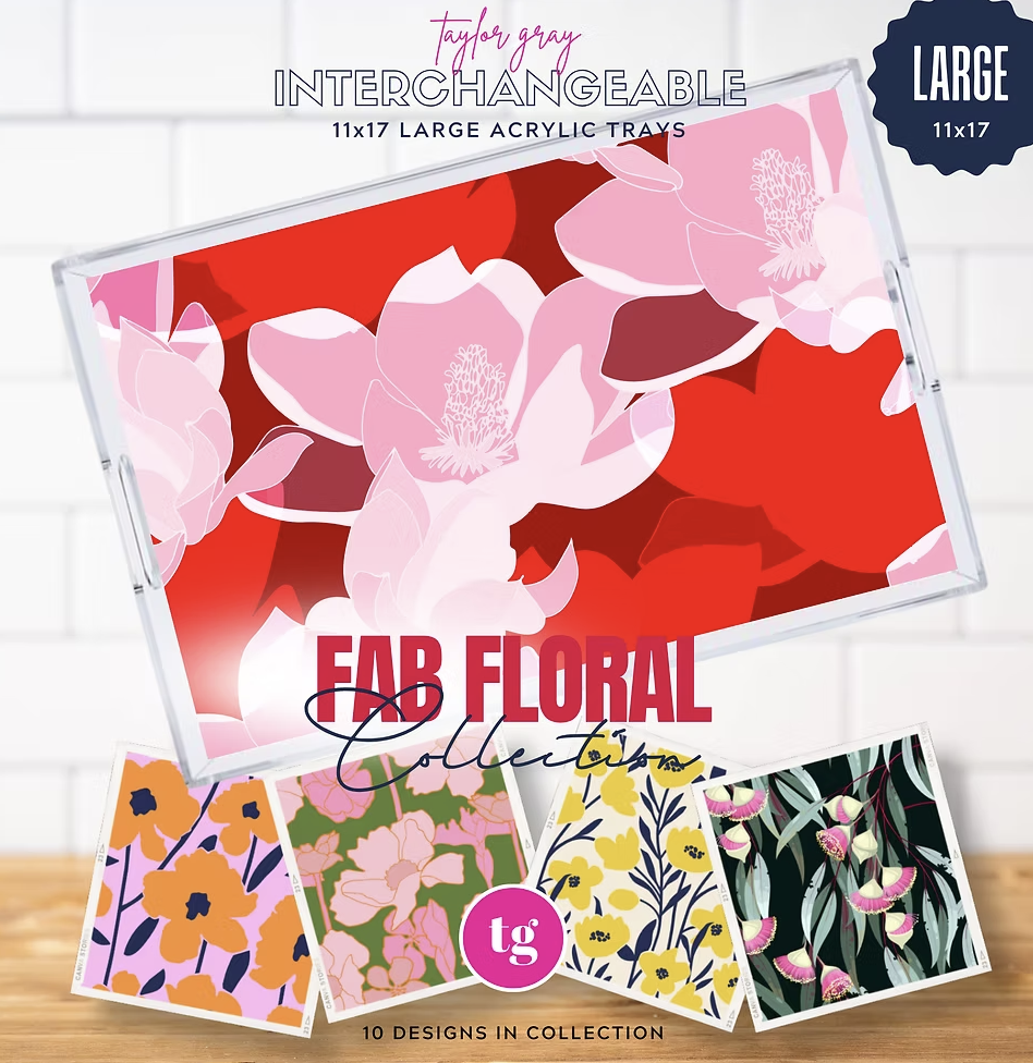 Acrylic trays are all the rage and are definitely on trend. Why should you settle for one design when you can have multiple designs and change them out on a whim? The TAYLOR GRAY acrylic tray is an extra-large 11×17 tray that perfectly fit our 11×17 insert designs. The pocket on the bottom of the tray allows the inserts to be easily interchanged and protected.