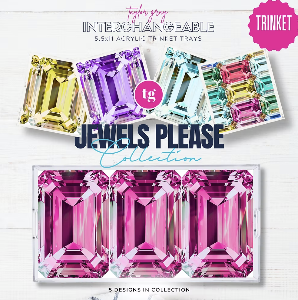 Acrylic trays are all the rage and are definitely on trend. Why should you settle for one design when you can have FIVE designs and change them out on a whim? The TAYLOR GRAY acrylic trinket tray is perfect and petite tray with a pocket on the bottom of the allowing the inserts to be easily interchanged and protected.