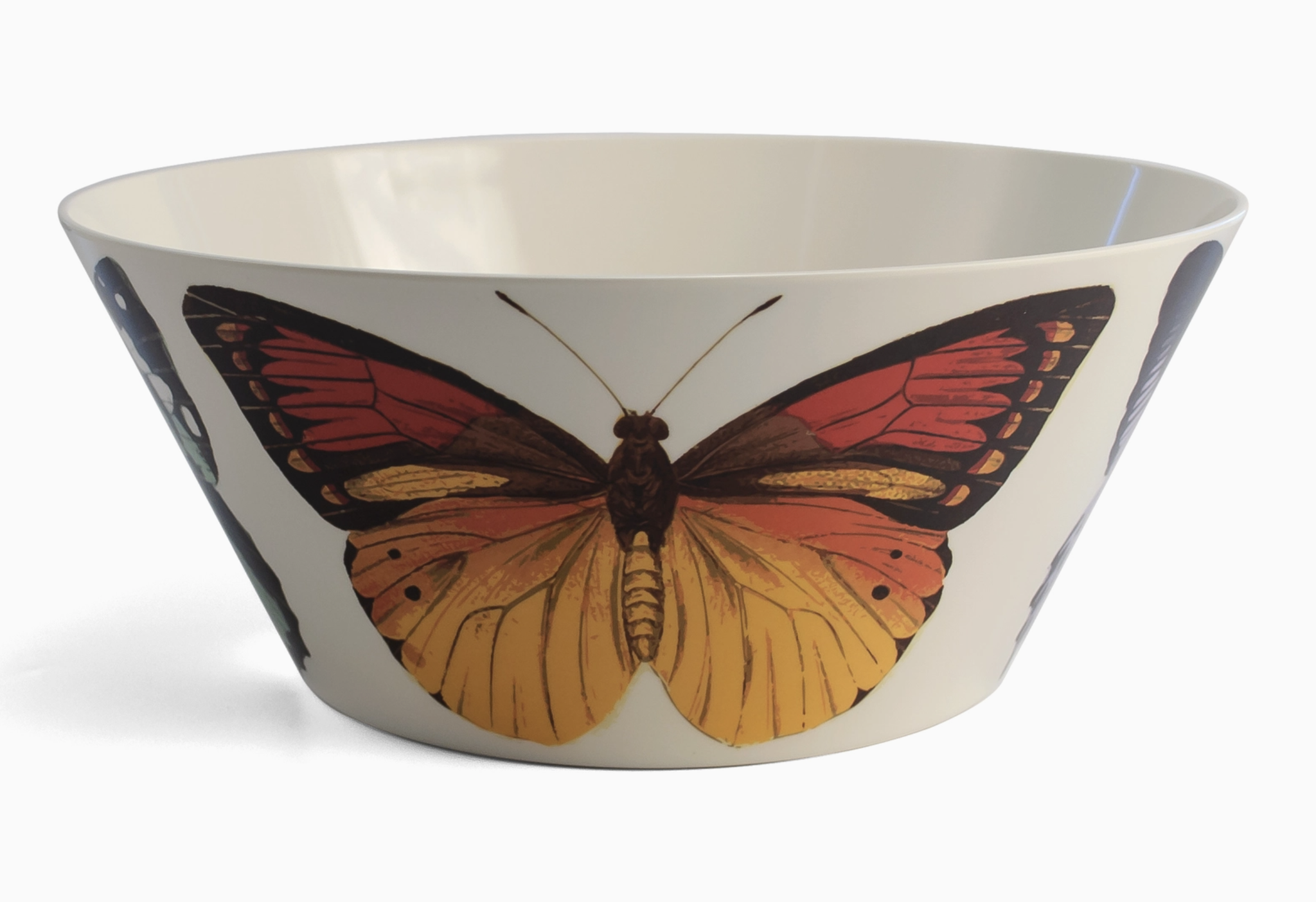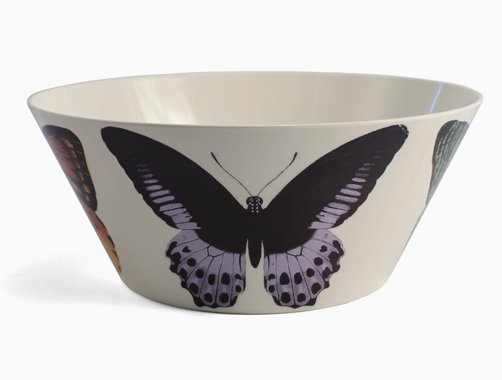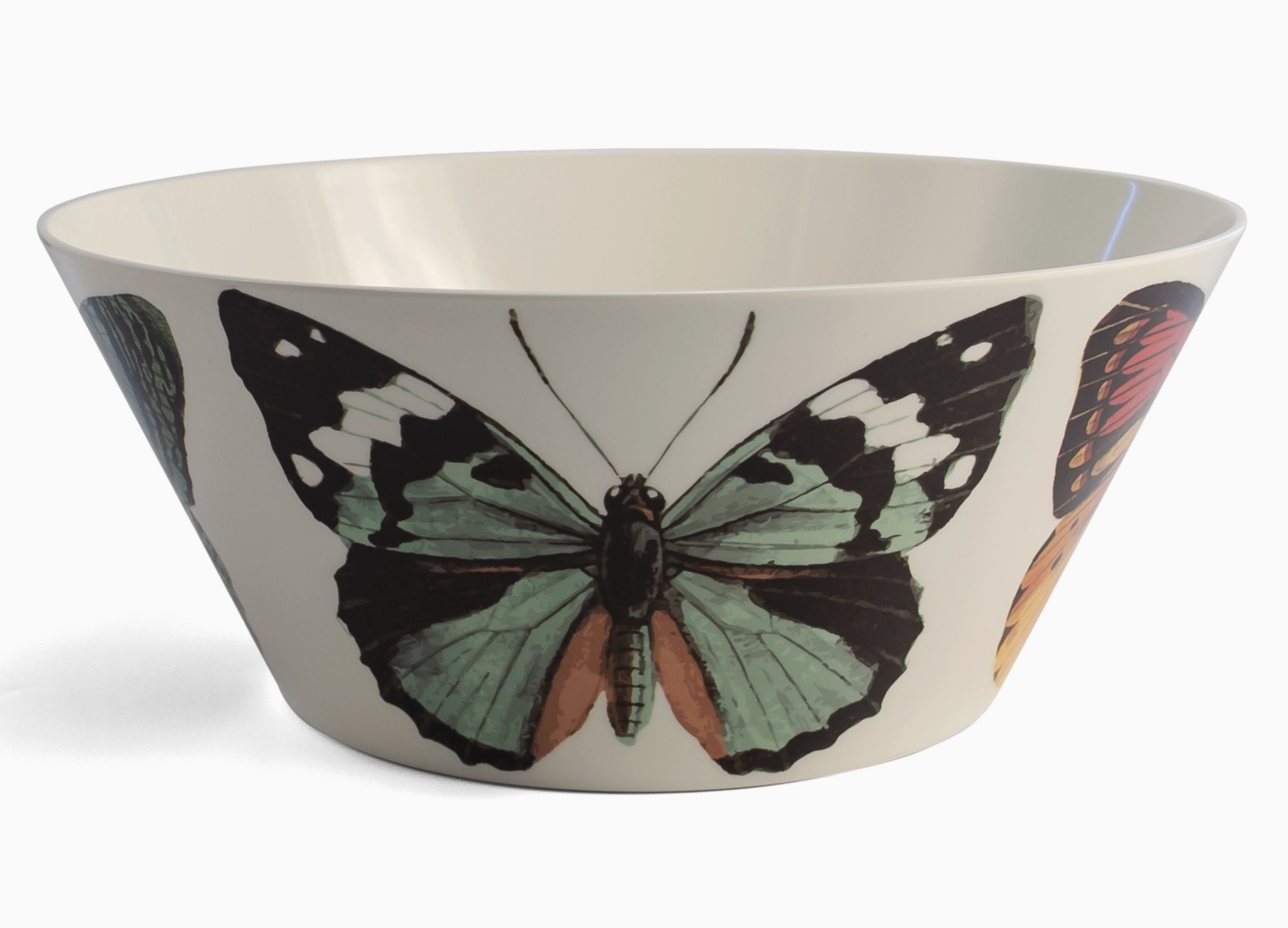 Our Metamorphosis collection features a garden full of butterflies, ready to transform your table. Metamorphosis Large Serving Bowl dishwasher safe BPA free do not microwave large sized bowl, perfect for salads and pasta measures 11.25″ D X 4.75″ H four different butterflies flutter around the sides, images show each side of bowl.